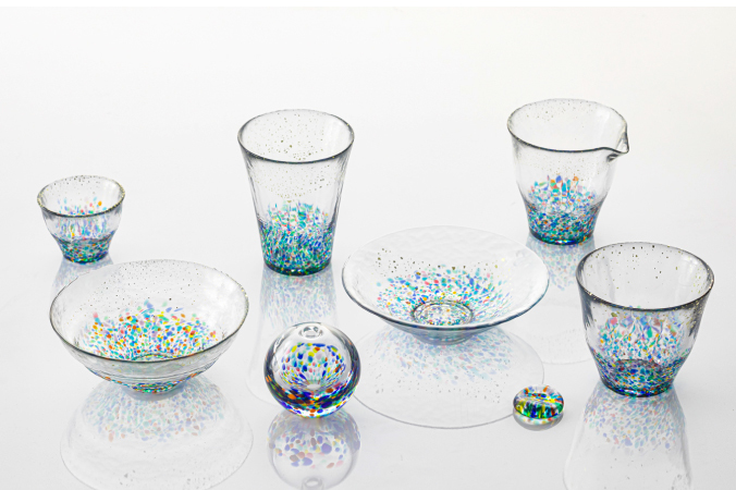 ADERIA 過去 50 年都深受大衆愛戴,「津輕びいどろ」為『ADERIA石塚硝子』旗下手工玻璃品牌。津輕琉璃特有的色彩秘訣,就是來源於他們自己生產的玻璃顆粒,顏色達到上百種,有專門的匠人負責研究新的顏色,不斷的開發出新的色彩。吹制後的半成品,表面裹上一層玻璃碎,在一一個浸濕的碗狀工具裏面滾動,然後放到高溫的爐裏面,將碎玻璃熔化,成為津輕硝子最耀麗的色彩。
