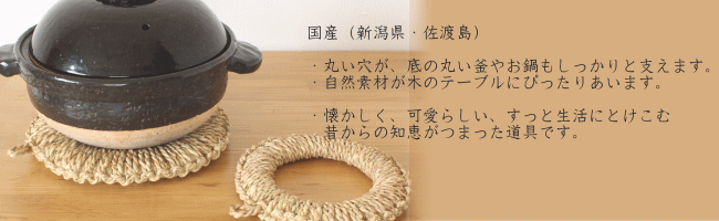 傳統日本家用草編鍋墊出產自新瀉縣佐渡島,自古以來不單是竹藝品受歡迎,用稻草桿製作的工藝品也相當盛行。用稻草桿編織成的鍋墊,手工編得緊實且牢固,加上外觀自然純樸的質感,帶有淡淡的草香,很受日本主婦歡迎,樸質耐用,吊掛裝飾在廚房,也相當可愛,適合當餐桌造型擺設,為家裡增添溫暖的味道。簡單好看而方便,可以承受鍋子和水壺的重量和熱量。尺寸分別有3種,小的很適合放咖啡壺和茶壺,中/大的可以放各種燒水壺和鍋子。